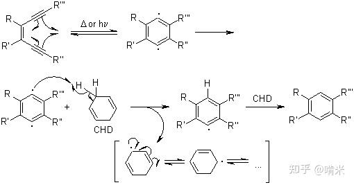 当把两个炔基中间夹一个烯基组合起来(烯二炔),只要给这个体系一点点能量,或者改变一下构象,让两端的炔基向中间靠拢,距离小于 3.2Å时,旧键断裂,新键生成,分子瞬间向内塌缩成一个1,4- 去氢苯的双自由基。