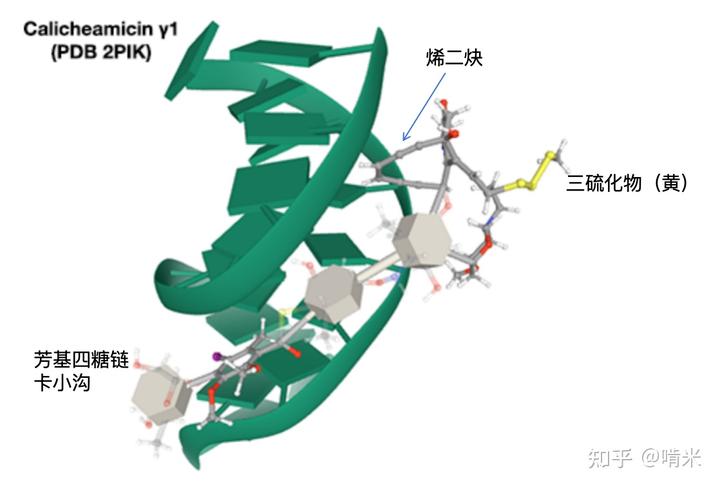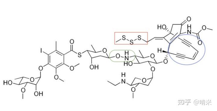 其结构分三个部分:三硫键触发器(红框),杀伤性的烯二炔(蓝圈)和余下的用于精准制导的四糖单元(包含特殊的羟胺类 N-O 糖苷键,绿圈)。三个部分相辅相成,协同作用,精确锁定敌方的 DNA,将其一刀两断,相当于在万军丛中直取敌方将领首级,令敌军群龙无首而溃败。