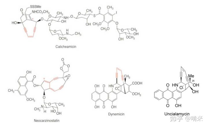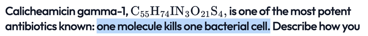 卡利奇霉素γ1(Calicheamicin γ1)所代表的 1,5- 二炔 -3- 烯(enediyne)类抗生素。有记录一个分子足以杀死一个细菌: