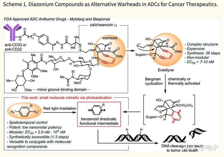 要切断 DNA 双螺旋的稳定骨架,所需的能量极大,常规的化学手段难以做到,你需要活性极高的自由基,并且要到敌方大本营后再产生,不然自己就先被炸死了。因此,这种自由基的产生必须依赖某种极强的化学驱动力,在合适的位点和精密的触发条件下,被驱动引爆。