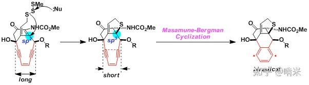 所以,当卡利奇霉素游荡在胞外时,三硫化物没啥反应,炸弹处于保险状态。一旦分子穿透细胞膜,进入敌方内部,高浓度的 GSH 就是扣动扳机的手指:GSH 亲核进攻三硫化物的 S-S 键,释放出一个极其活泼的硫醇,接着这个硫醇通过分子内 Michael 加成,攻击分子内相邻的α,β- 不饱和酮,导致桥头碳原子从 sp²杂化变成了 sp³杂化,环的构象突变,通过机械的杠杆传动,迫使两个炔基靠近,从不反应的 3.6 埃,弯曲成一点就着的 3.0 埃。