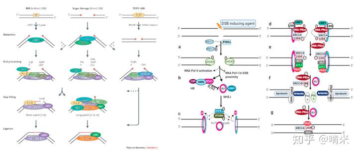 假如是单链断裂(SSB),细胞还可以通过碱基切除修复(BER)和单链断裂修复(SSB repair)机制,准确修补缺口。但在位置相近且同时断裂的双链处(卡利奇霉素造成的断裂通常相隔 2-3 个碱基对),细胞无法获得修复模板,同源重组修复(HRR)或非同源末端连接(NHEJ)极易出错,如果断裂发生在关键的基因(比如管家基因),那么细胞面临的结局就只剩周期停滞或凋亡。