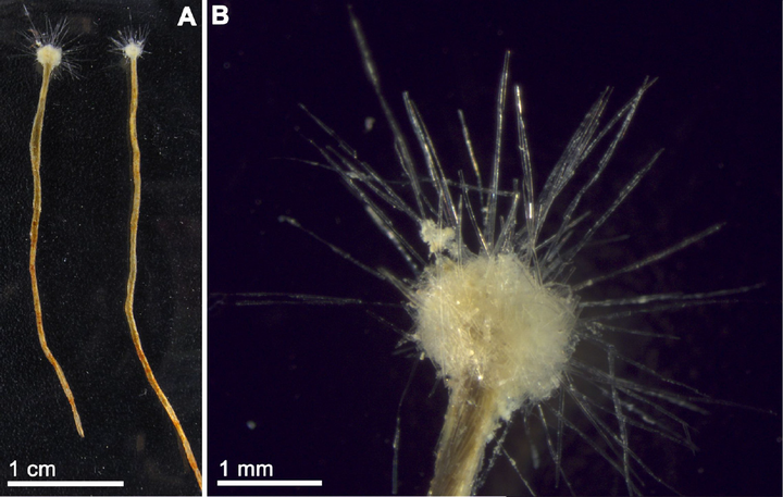 当然,还有比它体型更大的单核单细胞生物。没错,我说的正是伞藻(Acetabularia)。作为中学课本里的著名生物,伞藻的嫁接实验证明了细胞核是细胞遗传的控制中心,而之所以选择伞藻,正是因为它体型大(可以长到十厘米)、易于观察,且只有一个细胞核。如其名,伞藻的样子就像一把撑开的小伞,而细胞核就在隐藏在其下方的假根(rhizoid)中: