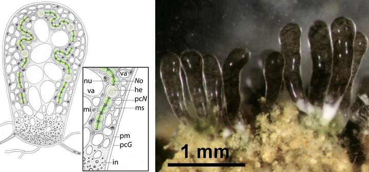 这种魔幻的生物是一种真菌(Fungi),确切地说,是球囊菌门(Glomeromycota)的梨状土虹菌(Geosiphon pyriformis;其实也可以直接说土虹菌,因为这个属只有一个物种)。有些读者或许已经猜到了,它其实也是合胞体,而内共生于其中的是念珠藻属(Nostoc)的蓝细菌: