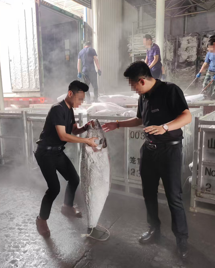 没错,这一车冰坨子就是金枪鱼,每次工厂卸金枪鱼动静都挺大的。