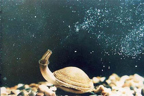 双壳纲的各种贝类大多是滤食性的,它们会吸入水流,并过滤取食水流中的浮游动物、藻类和有机碎屑等