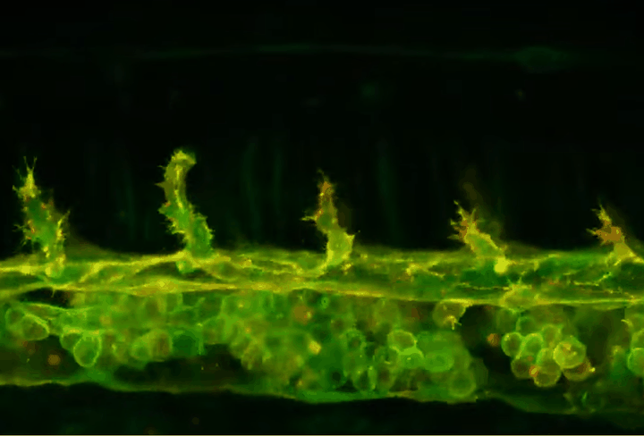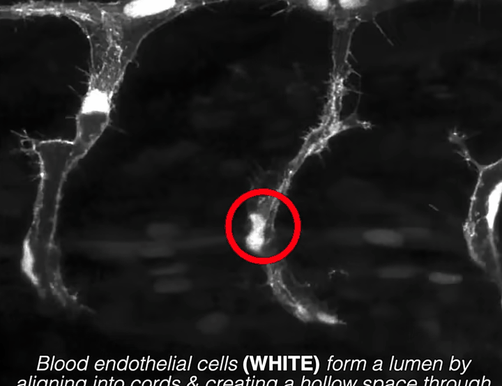 这里又要请出我们的老朋友斑马鱼了,斑马鱼基因跟人类 70%相似,而且全身都透明,特别适合用来做实验。科学家就在显微镜下观察斑马鱼胚胎的血管形成。