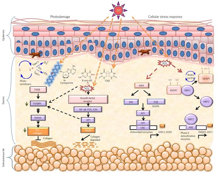 紫外线不仅能破坏胶原纤维和弹性纤维,使得皮肤失去弹性,还能破坏产生它们的成纤维细胞,从而导致皮肤难以再恢复如初。