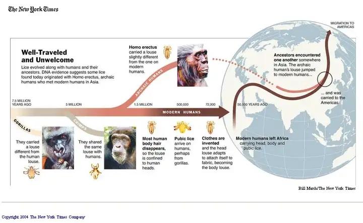 通过 DNA 溯源,研究者发现,人类头虱又大约是从 330 万年前起源于大猩猩虱。