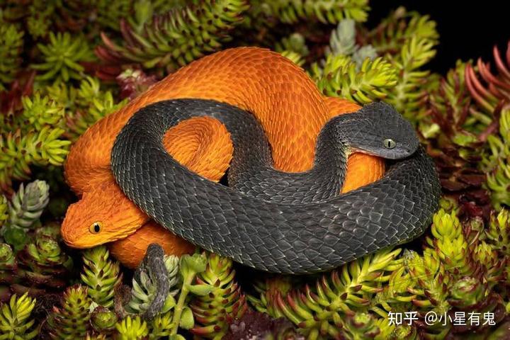 鳞树蝰 (Atheris squamigera)橙色和黑色个体