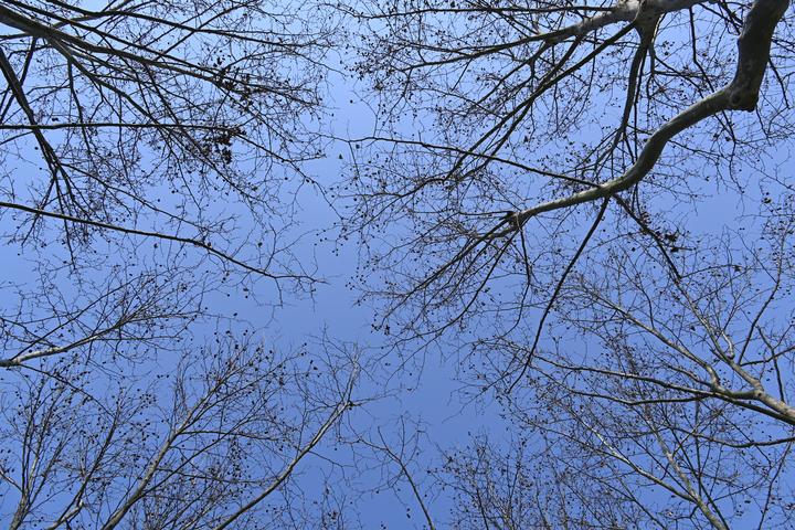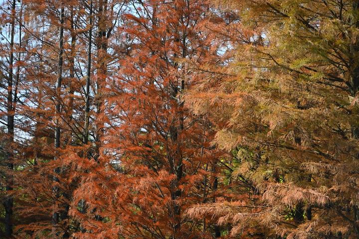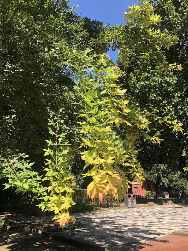 当秋的温度漫出来,蓝天像是块块透亮的玻璃,树也掺了点秋意的沉郁↓