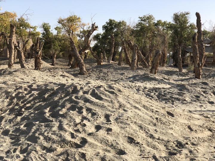 有的像半干的河滩,流沙变成了层层叠叠的样子,表面快要风干了,变成了灰白色,往下挖一些,就能看到深处的黄沙↓