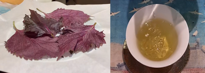 乍一看这种做法就相当儒雅。用现在的话来讲,是将紫苏叶隔火烘烤,待香气溢出收起。用滚水洗泡一次,时间不能太久,再用滚水泡着喝。以干紫苏叶为主的古老饮料,其气味辛散芳香,外能解表散寒、内能行气宽中,保护人体阳气,适应酷暑天气。