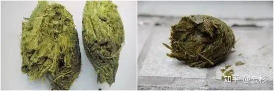 看下面的图片,左边是熊猫进食竹竿后的粪便,右边是进食竹叶后的粪便。