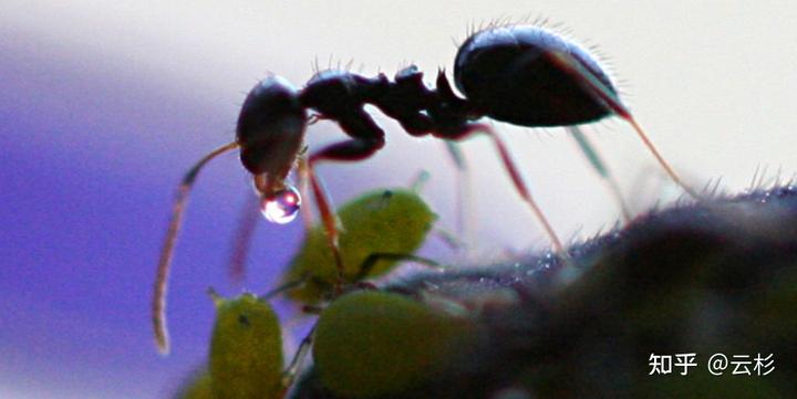 蚂蚁就会跟着蚜虫屁股后面嗦蜜露,还会主动保护蚜虫、介壳虫:
