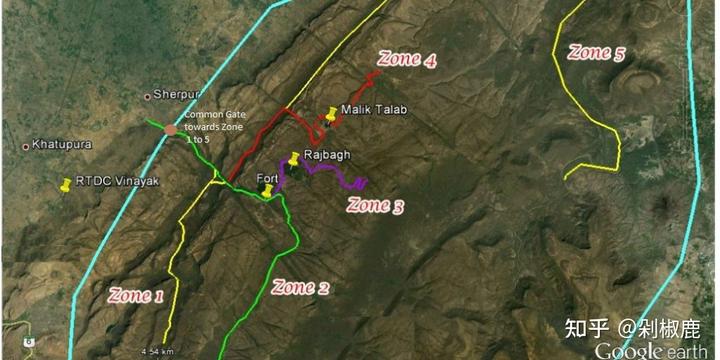 第 4 和第 5 区的地形更为复杂,有巨大岩石和森林覆盖。尽管在这些地方看到老虎的频率不大,但它们仍然提供了更自然的老虎观赏机会,但是这里人工道路不多,没有其他区域那样的旅游主干道。