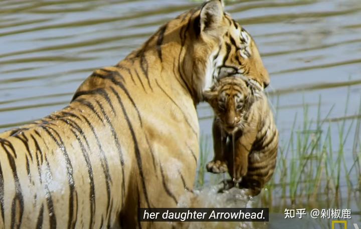 但是虎父无犬子,虎王家族总是血债血还的,箭头后来成为了继祖母 Machli 之后最强、数量最多的沼泽鳄绞杀者,敢于跳入深水区独自猎杀鳄鱼。