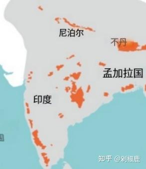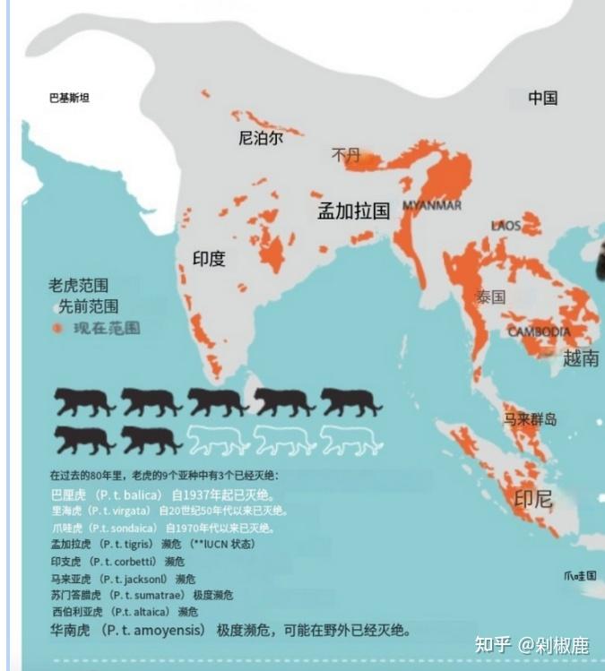 仅在图中的印度、孟加拉国、尼泊尔、不丹有零星分布,我国藏南地区估计有十只左右的孟加拉虎分布。