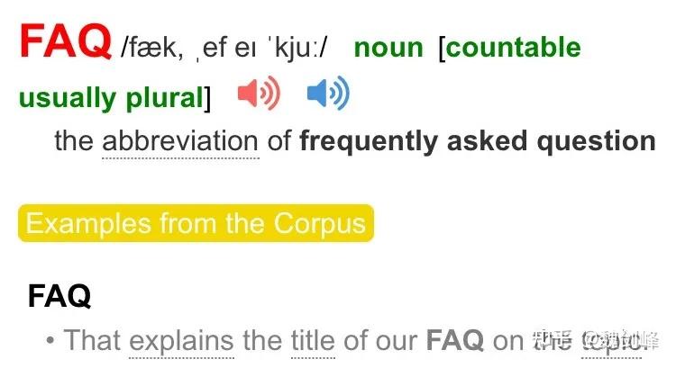 比如我们经常见到的 FAQ (Frequently Asked Question),它可以读成 F-A-Q,也可以读成 /fæk/,并且第二种读法在美式英语里面比较常见。