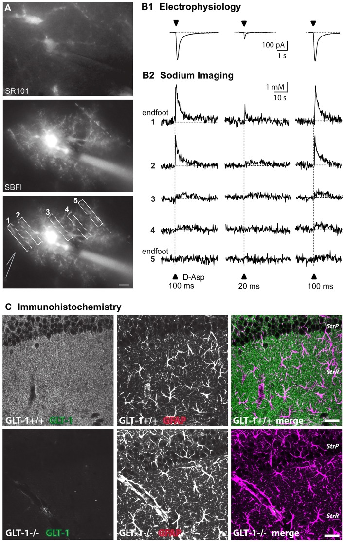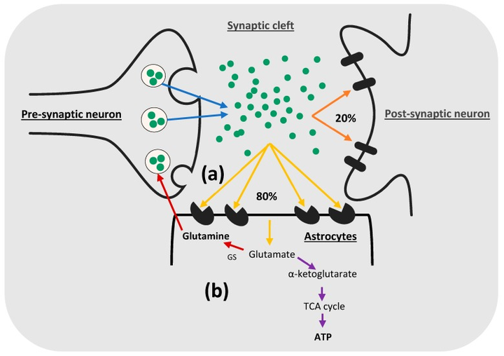 这些细胞会紧贴在突触周围,表面布满谷氨酸转运体(主要是 GLT-1 和 EAAT2)。神经元一放完谷氨酸,这些转运体立刻把它吸走。[2]