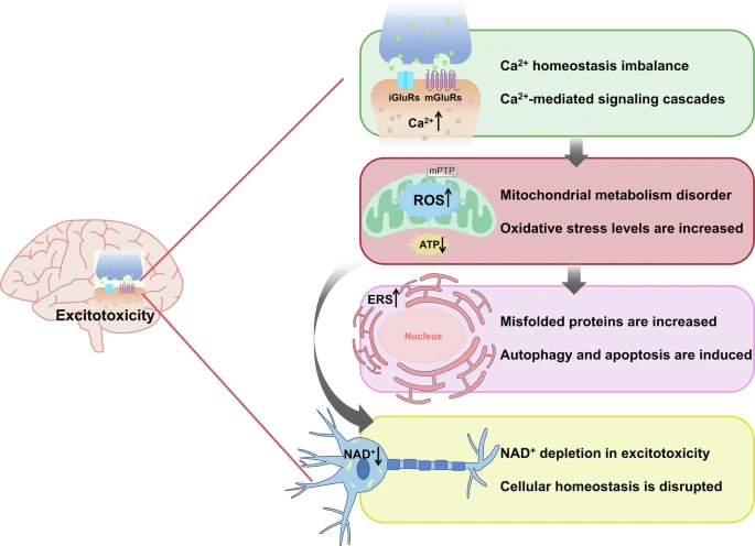 这时候 NMDA 受体和 AMPA 受体会被过度激活,大量钙离子涌入细胞。钙离子一多,就会激活一系列酶——蛋白酶、核酸酶、磷脂酶等等,这些酶会破坏细胞骨架、损伤 DNA,最终导致神经元死亡。[1].