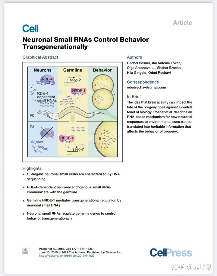 - 2019 年 6 月 6 日,以色列特拉维夫大学 Oded Rechavi 领导的团队在Cell杂志发表长文,揭示了神经元中表达的双链 RNA(dsRNA)结合蛋白 RNAi deficient 4(RDE-4)通过调控小 RNA 的生物合成来控制线虫趋化行为的代际间传递。(文章链接:https://www.cell.com/cell/fulltext/S0092-8674(19)30448-9)