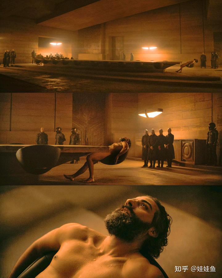 哈克南男爵的家则借鉴了教堂的样式,光线从顶部垂直射下,向上升起的男爵仿佛十字架上肥胖版的耶稣。