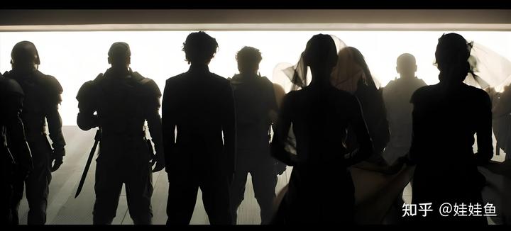 多人站位:唯一的女性杰西卡位于正中,左右各有 5 人,左密而右松。只有雷托公爵和保罗负手站立,显示出他们与众不同的身份。