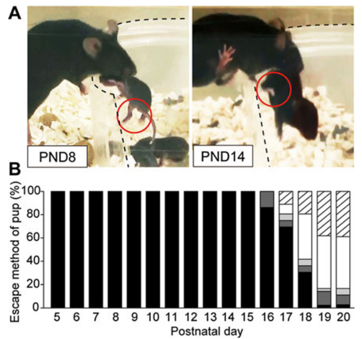 C57BL/6 小鼠中,这个反应在出生后第三周末(约第 21 天,上表),随小鼠开始自主行走而完全消失。