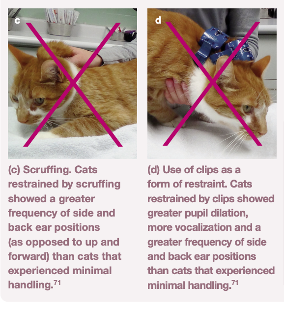 2020 年,加拿大圭尔夫大学的穆迪(Moody)等人测试了四种保定方式(被动保定、手动抓颈背、夹子、全身保定)对猫行为和生理指标的影响[8]