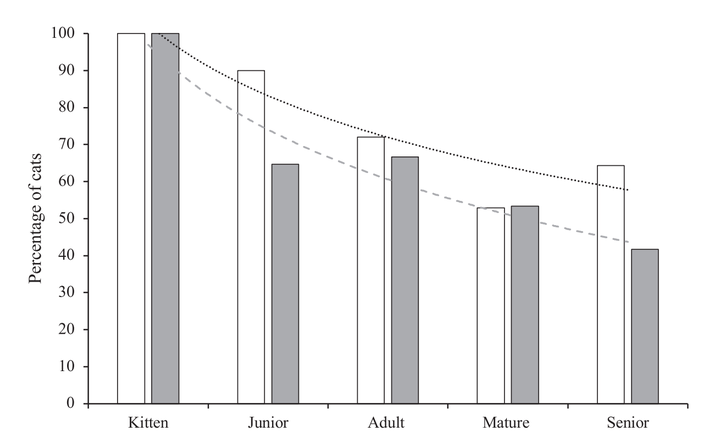 他们测试了 142 只家猫,按生命阶段分为五组: