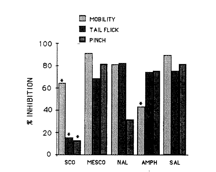弗莱施曼(Fleischmann)和他的团队在 1988 年发现[3],夹住小鼠颈背诱导的不动反应可以被安非他明(一种多巴胺激动剂)逆转,也可以被多巴胺拮抗剂氟哌啶醇模拟。同时,伴随的镇痛效应不能被纳洛酮阻断,说明不走阿片类通路,而是涉及胆碱能系统。