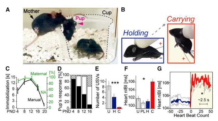 小鼠幼崽被捏住颈背提起来时,反应完全一样:停止超声啼叫,停止挣扎,心率降低,四肢蜷缩成紧凑姿势。