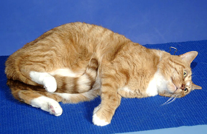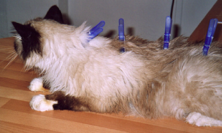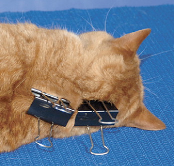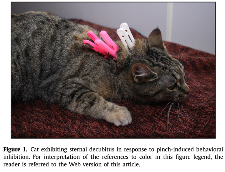 她们测试了 31 只猫(13 只健康猫,18 只患有特发性膀胱炎的猫),用长尾夹夹在颈背正中线 C1 到 C7 之间,夹力大约 140 到 160 毫米汞柱,接近猫的收缩压。