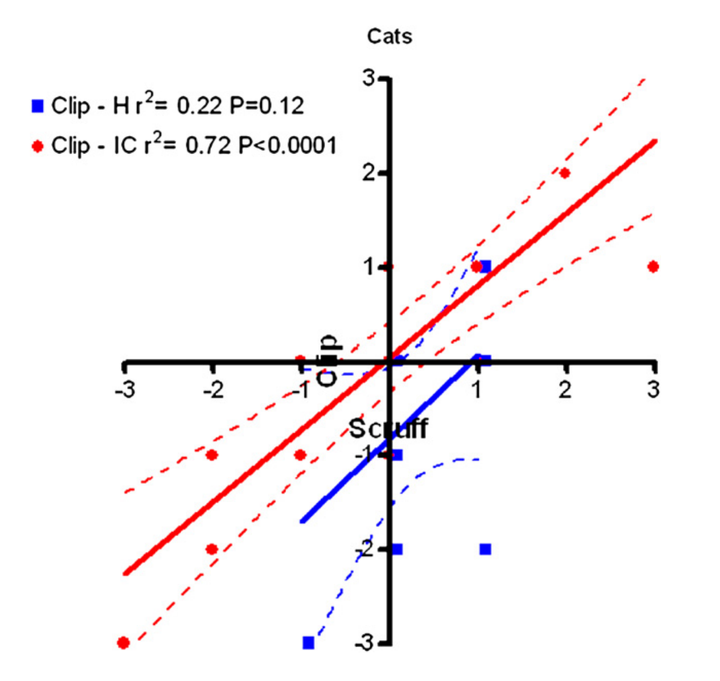 可以看到,特别是对于生病的猫,这两种保定方法的反应之间存在高度的正相关。