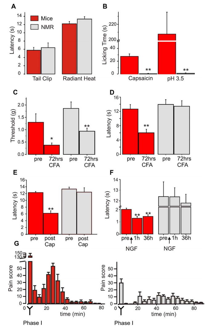 下图用红色(小鼠)和灰色(裸鼹鼠)的柱状图直接对比两个物种对各种疼痛刺激的行为反应: