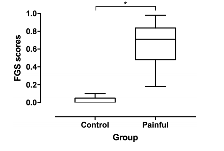 下面疼痛组猫的 FGS 中位数为 0.71(范围 0.18–0.98),对照组为 0(范围 0–0.1),p < 0.001,证明 FGS 确实能区分有痛和无痛的猫。