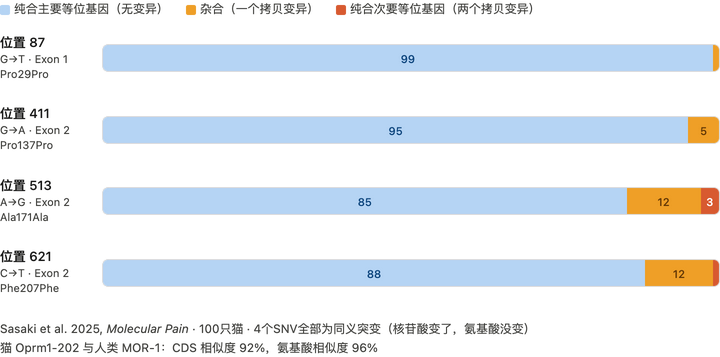 同样是 2025 年,发表在《Molecular Pain》上的一项研究对 100 只不同品种猫的μ- 阿片受体基因(Oprm1)进行了测序[4]。猫的μ- 阿片受体在进化树上比啮齿动物更接近灵长类。
