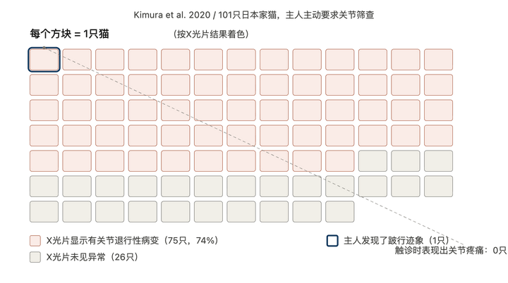 2020 年,一个日本研究团队给 101 只猫做了全面的骨骼 X 光筛查,其中 75 只存在四肢关节退行性病变,41 只存在脊椎退行性病变。