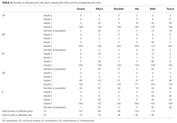 四肢关节有问题的 75 只猫里,主人注意到跛行的只有 1 位;脊椎有问题的 41 只里,主人注意到步态异常的也只有 1 位。整个研究中,兽医触诊时没有任何一只猫表现出明显的关节疼痛[1]