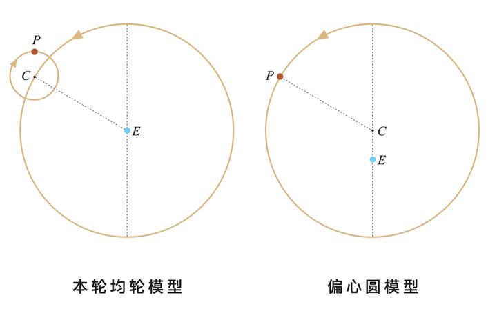 下图中,左边就是大家熟悉的本轮 - 均轮模型,星球 P 在一个小圆上作匀速圆周运动,同时小圆的圆心 C 又绕着中心天体 E 作匀速圆周运动,且 CP 连线保持一个固定的指向(相当于一年转一圈)。右图是简化的偏心圆模型,星球 P 在以 C 点为圆心的大圆上作匀速圆周运动,而中心天体 E 偏离圆心 C 一点点。